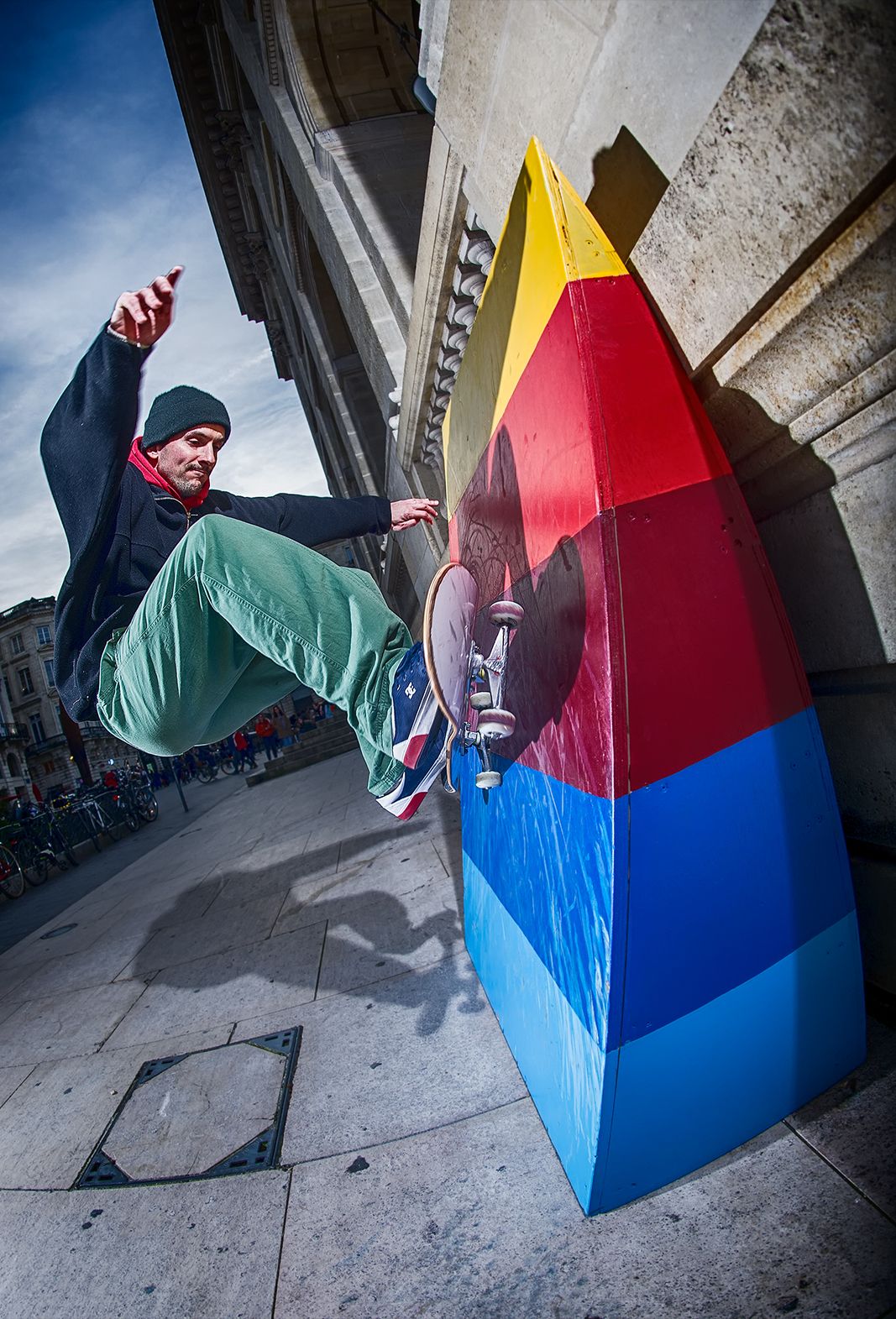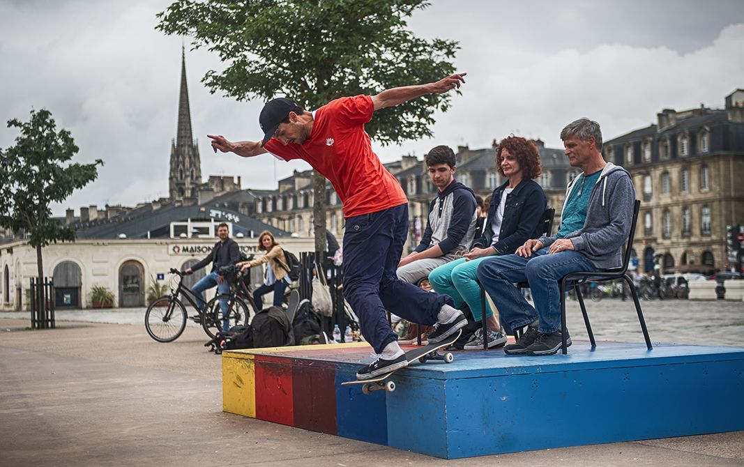Rather than confine skaters to skateparks, Leo got officials to allow skateboarding at some of the best city center spots during certain hours, where it had previously been illegal. The city even let Leo’s crew skate and film inside the historic Opéra National de Bordeaux. The culmination of Leo’s ambitious vision was the PLAY! Project for Liberté Bordeaux, an exhibition of playable and skatable installations displayed in public spaces. The skateable art pieces were placed in public spaces throughout the city, free for anyone to play, skate, nap, eat, or sit on.